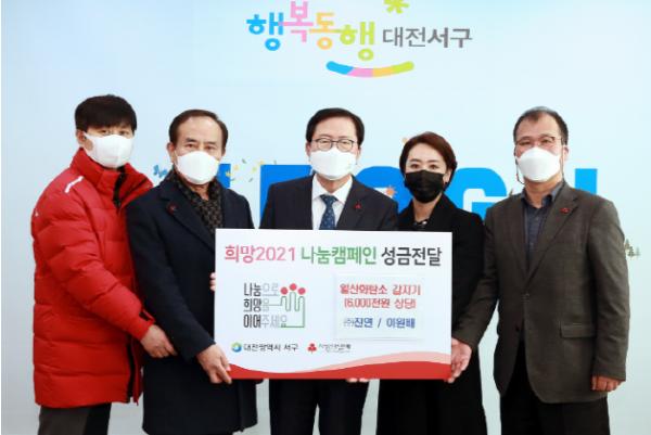 [한국연예축제일보, 유혜경기자] 대전 서구는 지난 29일 구청에서 ㈜진연(대표 성희수)와 이원배 갈마1동 주민자치회장으로부터 일산화탄소 감지기 60대(600만 원 상당)를 기탁받았다.