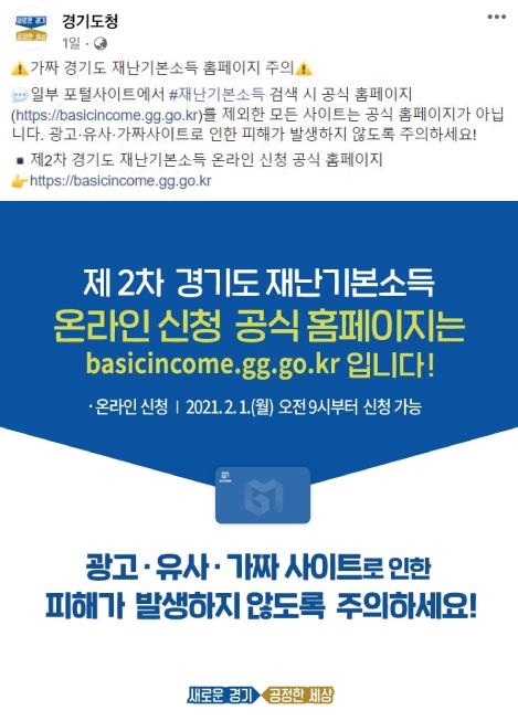 [한국연예축제일보, 유혜경기자] 경기도가 코로나19로 인한 경제위기 극복을 위해 모든 도민에게 1인당 10만 원씩 지급하는 ‘2차 재난기본소득’ 신청이 2월 1일 시작될 예정인 가운데 핸드폰 번호를 요청한 후 소액결제 방식으로 돈을 빼가는 가짜 신청사이트가 적발돼 도가 적극 대응에 나섰다.