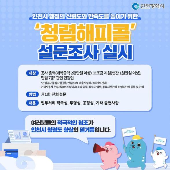 [한국연예축제일보, 유혜경기자] 인천광역시는 민원인에게 직접 담당 공무원의 업무 관련 청렴도를 묻고 건의사항을 수렴하는 ‘청렴 해피콜’을 연중 실시한다고 밝혔다.