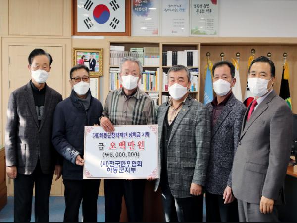(재)하동군장학재단(이사장 이양호)은 (사)전국한우협회 하동군지부(지부장 이영주) 임원진이 지난 28일 군수 집무실을 찾아 미래 인재양성에 써달라며 장학기금 500만원을 기탁했다고 29일 밝혔다.