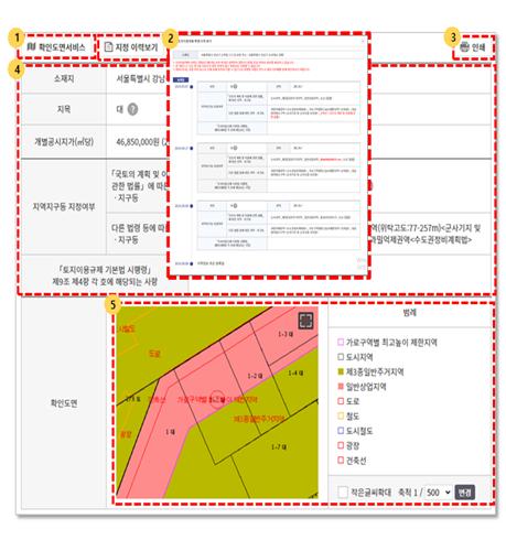 그동안, 토지이용계획 확인도면은 이미지파일로만 제공됨에 따라 지도의 이동, 확대, 지번 검색 등이 불가능 하였으나, GIS 서비스를 도입하여 지도 전체보기·확대·축소·가능하고, 특정 시점의 확인도면도 볼 수 있고, 네이버·다음의 민간 지도와 연계하여 위성지도와 비교, 로드뷰도 같이 볼 수 있게 개선하였다.