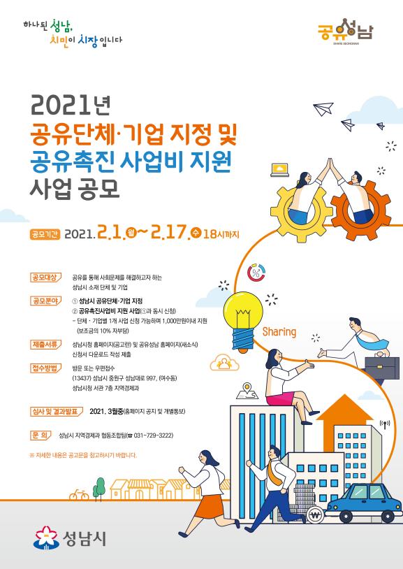 [한국연예축제일보, 안성경기자] 성남시는 나눠 쓰는 문화 확산을 위해 오는 2월 17일까지 공유 기업·단체와 촉진 사업을 공모한다.