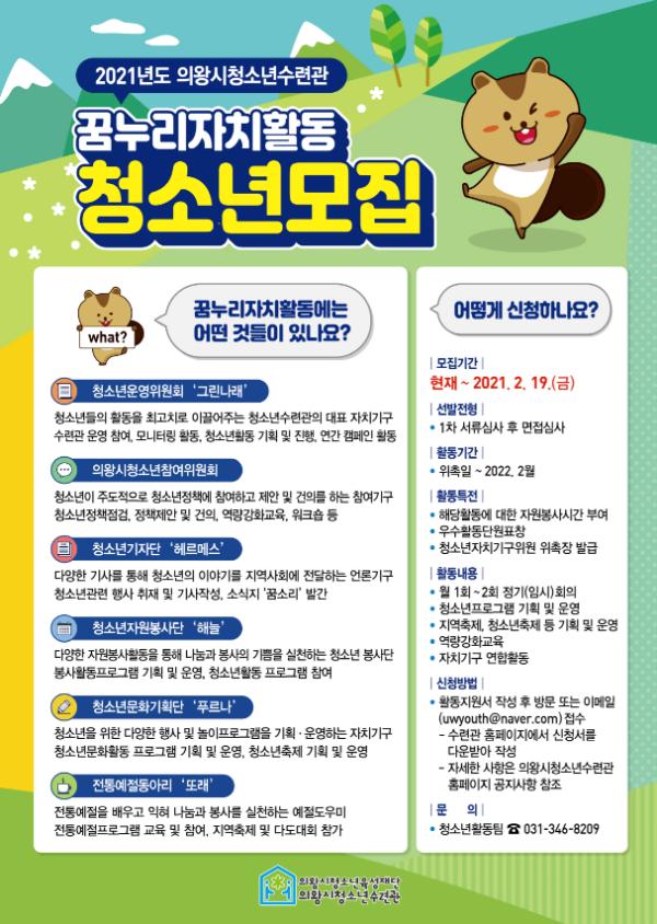 학교 수업 외 다양한 경험을 쌓고 청소년의 대표로서 수련관의 활동 문화를 이끌어 나갈 열정 가득한 14세~24세 청소년이라면 누구나 지원 가능하며, 오는 2월 19일까지 의왕시청소년수련관 홈페이지 공지사항에 있는 신청서를 다운 받아 작성 후 이메일로 신청하면 된다.