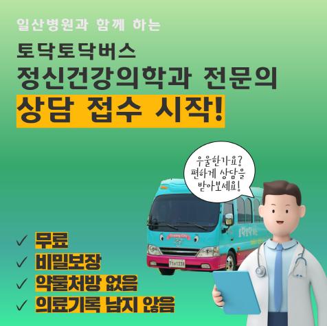 찾아가는 정신건강상담소 ‘토닥토닥 버스’는 정신건강 위험신호를 조기에 발견하고 회복치료를 진행할 수 있도록 일산병원 정신건강의학과 전문의와 일대일 상담 형식으로 운영한다. 진료 기록 및 상담비용이 발생하지 않고, 지속적인 상담 또는 치료가 필요한 경우에는 ‘정신건강 전문요원’과의 상담을 계속 이어갈 수 있다.