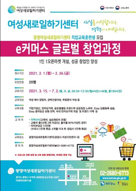 [한국연예축제일보, 안성경기자] 광명여성새로일하기센터는 2월 1일부터 2월 26일까지 직업교육훈련 ‘e커머스 글로벌 창업과정’ 참여자 20명을 모집한다.