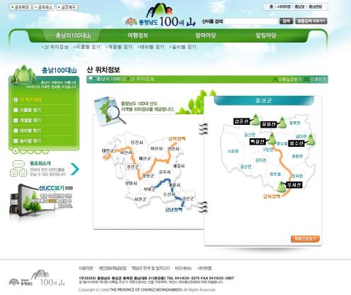 홈페이지는 충남의 100대 명산을 한눈에 볼 수 있는 위치 정보와 봄꽃, 계곡, 단풍, 바다, 설경 등 13가지 테마를 제공, 취향에 맞게 산을 찾도록 유도했다.
