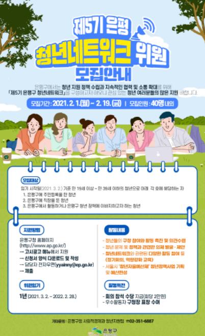 [한국연예축제일보, 유혜경기자] 서울특별시 은평구는 청년과의 지속적인 협력 및 소통을 통해 청년의 다양한 욕구를 반영한 청년정책을 실현하기 위하여 은평구 청년 네트워크 제5기 위원을 모집한다.