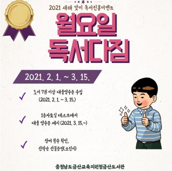 충청남도금산교육지원청금산도서관(관장 박찬희)은 금산 지역주민 대상으로 2월 1일부터 3월 15일까지 ‘도서관과 함께 책읽기, 월요일 독서다짐’ 행사를 운영한다.