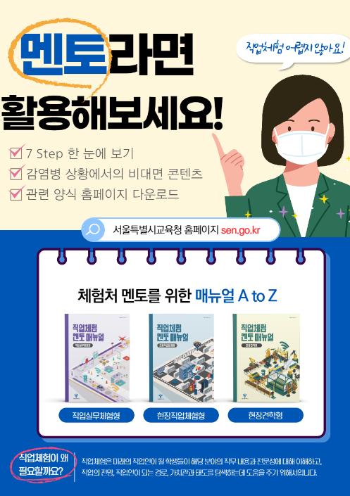 [한국연예축제일보, 서병진기자] 서울특별시교육청은 일터(체험처) 멘토의 역할 수행 지원 및 학생들의 진로탐색 기회를 확대하기 위해 「직업체험 멘토 매뉴얼」3종을 개발하여 보급한다.