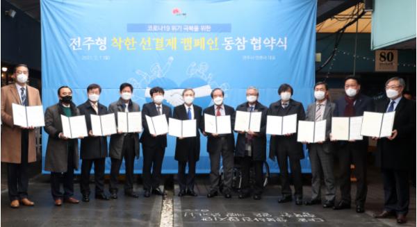 이날 협약을 통해 주요 방송·통신사와 신문사들은 사회적 거리두기로 어려움에 처해 있는 골목상권과 지역경제가 살아날 수 있도록 전 임직원이 ‘전주형 착한 선결제 캠페인’에 적극 동참하기로 뜻을 모았다.
