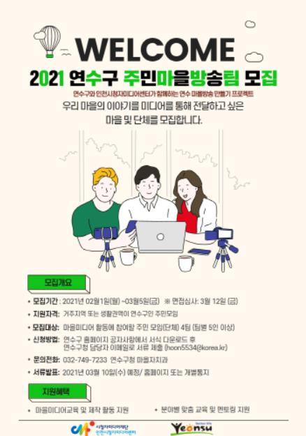 [한국연예축제일보, 유혜경기자] 인천광역시 연수구는 구민의 자발적인 미디어 참여와 마을미디어 활성화 사업의 일환인 ‘주민마을방송팀 지원사업’에 참여할 모임(단체)을 모집한다.