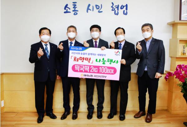 [한국연예축제일보, 유혜경기자] NH농협 서산시지부(지부장 이성구)가 1일 서산시를 방문해 설 맞이 희망 떡 200kg을 기탁했다.