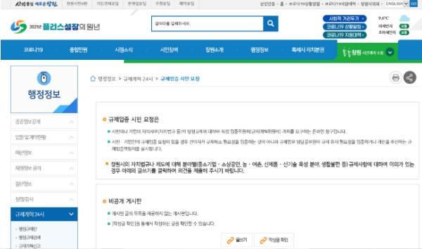 창원시민은 ‘규제개혁 24시’를 통해 창원시가 조례ㆍ규칙으로 정하고 있는 규제정보를 확인할 수 있으며 규제입증요청 창구를 통해 누구나 불합리한 규제에 대한 입증을 요청할 수 있다.