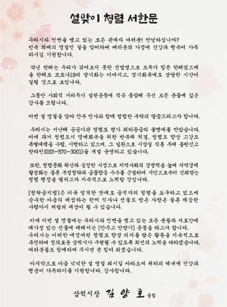또한, 지역사회의 인구감소 문제가 대두되고, 코로나 19로 인한 침체된 지역 상권을 살리는 방안으로 구상한 “삼척인 애타심 갖기 운동”은 오는 2월 1일 아침 간부회의시 김양호 시장의 담화문 발표를 시작으로 추진된다.