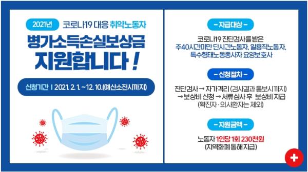 ‘취약노동자 병가소득손실보상금’은 일용직 노동자 등 취약노동자들이 코로나19 의심 증상이 있는 경우 생계 걱정 없이 안심하고 검진을 받을 수 있도록 유도하기 위해 경기도와 함께 추진하는 노동 방역대책이다.
