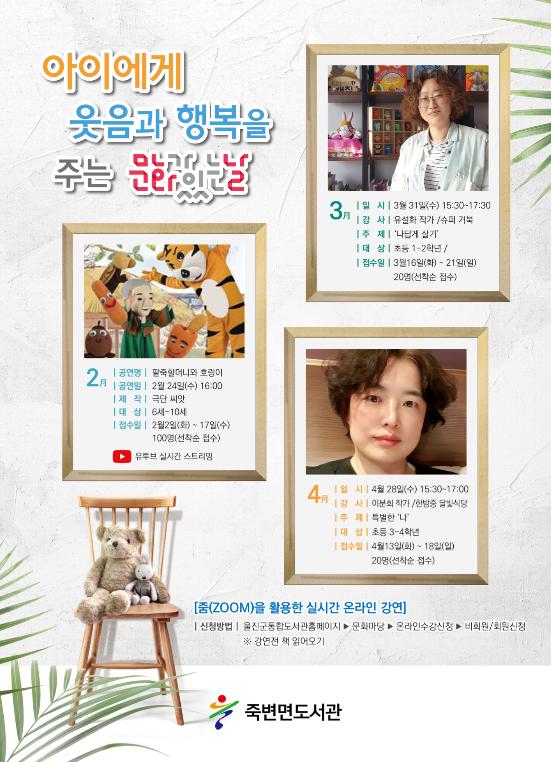그리고 3~4월은 줌(ZOOM)화상회의를 통해서 진행할 예정으로, 먼저 3월은 유설화작가의“나답게 살기”라는 주제로 그림책이 만들어지기까지의 과정 및 그림책을 소개하는 방식으로 진행할 예정이다.