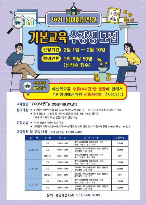 [한국연예축제일보, 유혜경기자] 인천 서구는 2021 주민참여예산 제도의 시행에 앞서 지방재정과 주민참여예산에 대한 주민의 이해를 높이고자 '2021 참여예산학교 기본교육’을 개설할 예정이라고 1일 밝혔다.