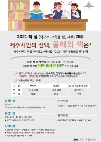 그 첫 단추는 시민이 직접 추천하고 선정한 ‘2021 제주시 올해의 책’을 선포하여 책으로 가득한 섬, 제주를 만들어가 가고자 하는데, 올해의 책은 전년도와 다르게 어린이, 청소년, 성인 부문에서 ‘제주 문학’ 부문이 새롭게 신설되어 4개 분야의 도서를 확장 선정할 예정이다.