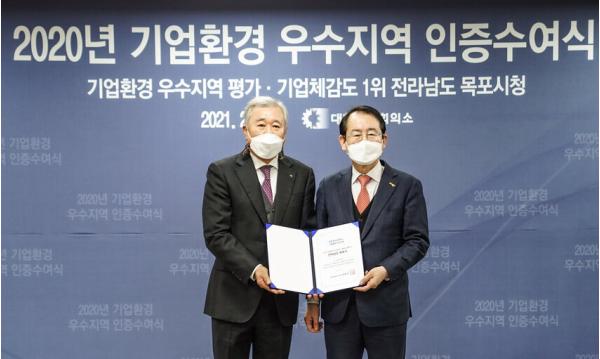 [한국연예축제일보, 안성경기자] 목포시가 대한상공회의소 주관 '2020년 기업환경 우수지역 평가'에서 전국 최고의 기업하기 좋은 지역으로 공식 인증받았다고 밝혔다.