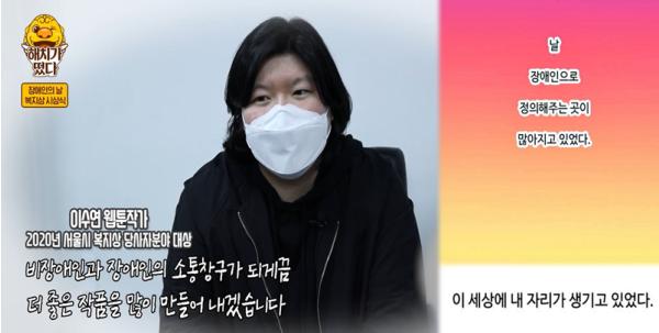 지난해에는 청각장애인이 일상생활에서 겪는 어려움 등을 에피소드 형식으로 재치 있게 담아낸 자전적 웹툰 《나는 귀머거리다》를 통해 장애 인식개선과 장애인 인권 증진에 앞장선 프리랜서 웹툰작가 ‘이수연’씨(청각장애, 여, 30세)가 대상을 수상하여 많은 사람들에게 희망과 감동을 전한바 있다.