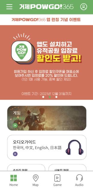 본 서비스를 이용하기 위해서는 구글 플레이 또는 애플 스토어에서 ‘거제 pow go 365’로 검색하여 설치 가능하며 어디서나 이용이 가능하다. 다만, 위치기반 게임인 ‘작전 1592’는 유적공원 내에서만 이용이 가능하다.