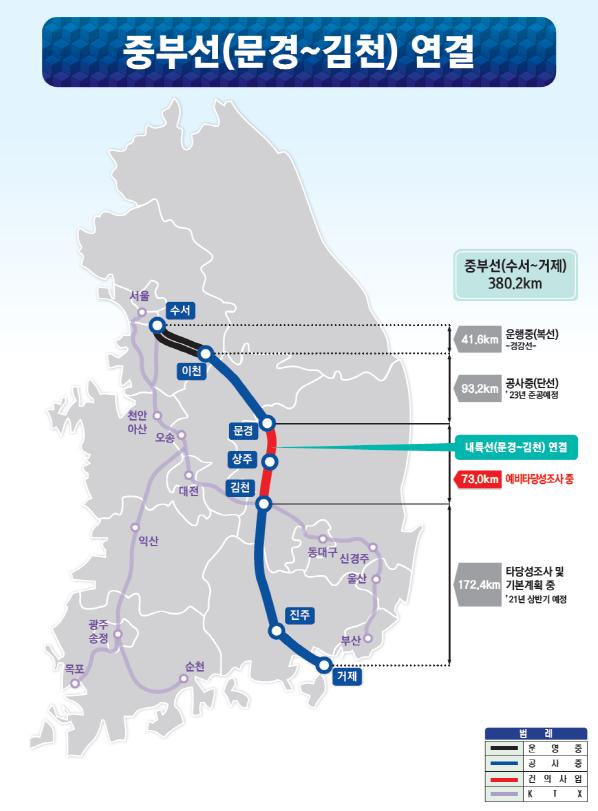 서울 수서에서 경남 거제를 잇는 중부선 철도는 현재 수서-이천구간은 이미 운행 중이고 이천~문경은 2023년 준공을 목표로 사업이 추진 중 이며, 김천~거제는 2019년 예비타당성조사 면제 사업으로 선정되어 현재 기본계획수립 중에 있다. 다만 중부선 전체구간 중 문경~김천 구간만이 2019년 예비타당성조사 대상사업에 선정되고 2년여가 지난 시점에도 사업추진이 확정되지 않은 상태다.