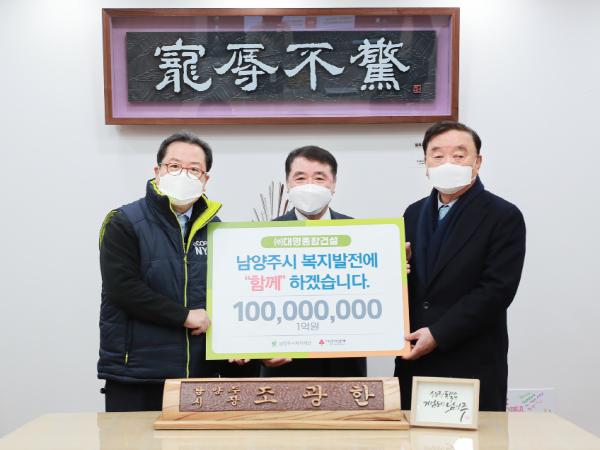 [한국연예축제일보, 유혜경기자] ㈜대명종합건설이 1일 남양주시 취약계층 지원을 위한 복지사업에 사용해달라며 총 1억 원의 후원금을 재단법인 남양주시복지재단에 전달했다.