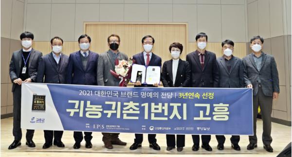 [한국연예축제일보, 유혜경기자] 고흥군은 지난 1월 28일 산업정책연구원(IPS)이 주최하고 산업통상자원부, 서울과학종합대학원, 중앙일보가 공동후원한「2021 대한민국 브랜드 명예의전당」‘귀농귀촌도시 부문’에 선정되어 2019년부터 ‘3년 연속 수상’하는 영예를 안았다고 밝혔다.
