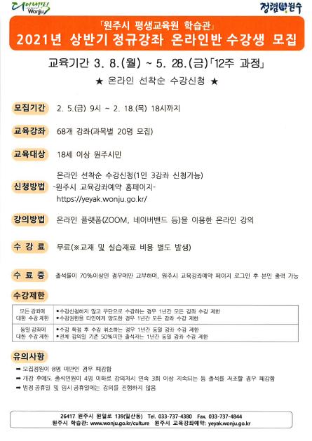 [한국연예축제일보, 유혜경기자] 원주시 평생교육원 학습관은 새해에도 코로나19 상황이 지속됨에 따라 대면교육 대신 언택트 교육환경을 구축하기 위해 2021년 상반기 정규강좌를 전면 온라인 방식으로 운영한다고 밝혔다.
