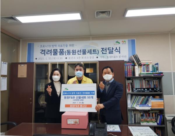 기부물품은 65천원 상당의 동원F&B제품으로 구성된 선물상자 50개로 구성되었으며 보건소 선별진료소 근무자, 역학조사반, 자가격리전담반 등 코로나19 방역 의료진 및 보건소 직원들에게 전달하여 할 예정이다.