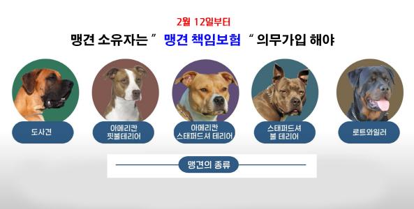 [한국연예축제일보, 유혜경기자] 개정된 동물보호법에 따라 오는 2월 12일부터 맹견 소유자는“맹견 책임보험”을 의무가입 해야 한다.