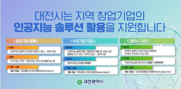 [한국연예축제일보, 안성경기자] 대전시는 인공지능이 필요한 지역의 기업에게 맞춤형 기술을 공급하고 창업기업의 기술혁신 가속화를 지원하는 ‘기업 맞춤형 인공지능 솔루션 활용지원 사업’을 추진한다고 밝혔다.