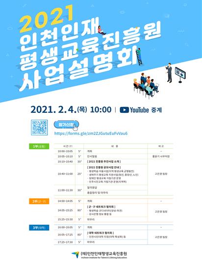 인천인재평생교육진흥원(사무처장 홍윤기)은 오는 2월 4일 10시 『2021년 인천인재평생교육진흥원 사업설명회』를 온라인으로 개최하며, 이는 유튜브(YouTube) 채널을 통해 생중계된다.