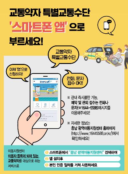 스마트폰 배차 앱을 이용하기 위해서는 사전에 특별교통수단 이용대상자로 등록돼 있어야 하며, 스마트폰에서 ‘충청남도 광역 이동 지원센터 이용자’를 검색한 뒤 본인인증 절차를 거치면 된다. 앱을 통해서는 관내 즉시 콜만 가능하며, 예약 및 관외접수는 상담원 전화와 문자메시지 신청만 가능하다.
