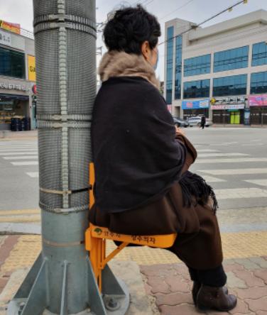 이번에 시에서 설치한 간이의자는 눈에 잘 보이도록 노란색으로 설치했으며, 횡단보도 인근 교통신호지주를 활용해 설치한 접이식 의자이다.