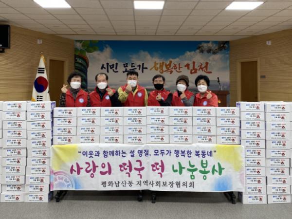 [한국연예축제일보, 유혜경기자] 김천시 평화남산동 지역사회보장협의체는 지난 1일 설맞이 사랑의 떡국 떡 나눔 행사를 실시하였다. 설을 앞두고 지역사회보장협의체 회원 20여명은 협의체 후원으로 모인 쌀 200kg로 만든 떡국 떡을 독거노인 및 저소득층 100여명에 전달하였다.
