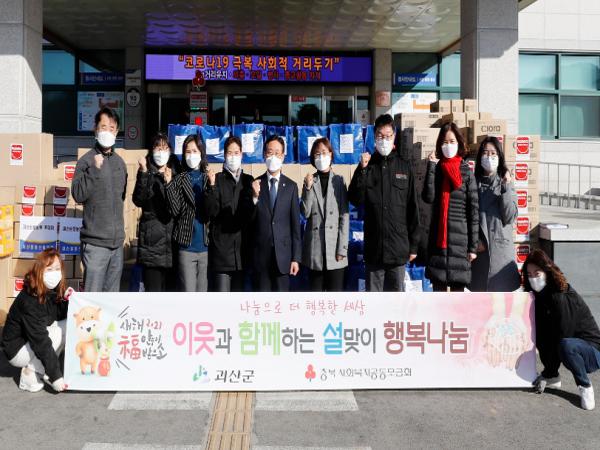 또한 괴산증평산림조합의 괴산군 농산물꾸러미(순정농부) 200세트, 미선나무식품화사업단의 손소독제 100박스, 생활개선회의 김 100박스 등 관내 기업에서 우리 지역의 취약계층의 따뜻한 명절을 위해 기부한 물품도 이번에 같이 전달된다.