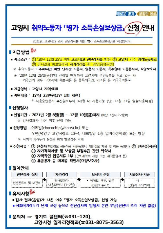 [한국연예축제일보, 김재만기자] 고양시가 취약계층 노동자가 생계 걱정 없이 코로나19 조기 진단검사를 받을 수 있도록 2021년 병가소득 손실보상금 지원사업을 확대 시행한다.