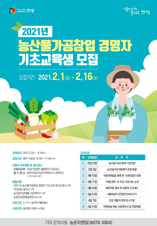 안성시농업기술센터(소장 조정주)는 오는 16일까지 2021 농산물가공창업 경영자 기초교육생을 모집한다고 밝혔다.