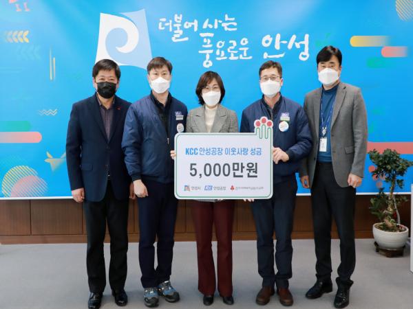 이에 김보라 안성시장은 “지역사회 나눔을 통해 행복한 세상을 만들어 가시는 ㈜KCC 안성공장 임직원 분들께 감사드리며, 이웃들에게 희망과 사랑을 잘 전달하도록 하겠다”고 말했다.