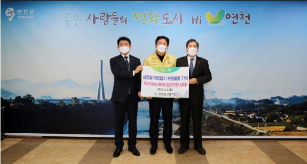 김광철 연천군수는 “수익금의 일부를 지역사회 환원하여 연천군 소외된 어려운 이웃을 위한 사랑나눔과 더불어 살아가는 지역사회를 만들어 가는데 큰 도움이 될 것으로 기대하며 후원물품을 기탁해주신 임직원 및 조합원분들께 진심으로 감사드린다.”고 말했다.