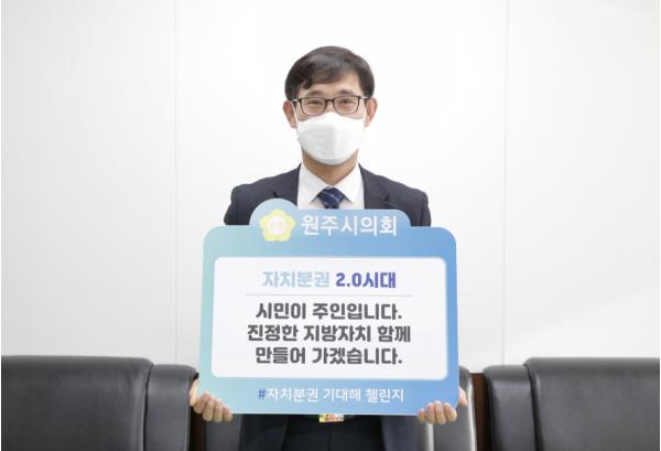 [한국연예축제일보, 변현식기자] 원주시의회 조용기 의회운영위원장은 2월 2일 ‘자치분권 기대해’ 챌린지 캠페인에 동참했다.