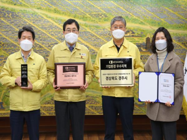 [한국연예축제일보, 유혜경기자] 경주시가 지난 1일 대한상공회의소로부터 ‘2020 기업환경 우수지역 평가 경제활동친화성 개선 1위’ 인증서를 전달받았다.