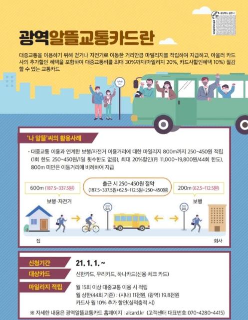 또한, 광역알뜰교통카드 대상 카드는 신한카드, 우리카드, 하나카드(신용·체크)로 광역알뜰교통카드 홈페이지 등에서 신청할 수 있다.