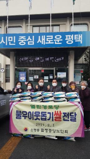 [한국연예축제일보, 유혜경기자] 평택시 신평동 합정중앙경로당은 지난 1일 신평동행정복지센터를 방문해 저소득 이웃을 위해 써달라며 회원들이 십시일반 모은 성금으로 쌀(10㎏) 40포대를 전달했다.