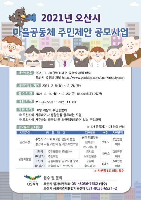[한국연예축제일보, 유혜경기자] 오산시는 시민이 안전하고 행복한 삶을 만들어가는 ‘오산시 마을공동체 주민제안 공모사업’사전설명회를 코로나19로 인하여 비대면으로 동영상을 유튜브로 배포하고 주민모임을 모집할 예정이다.