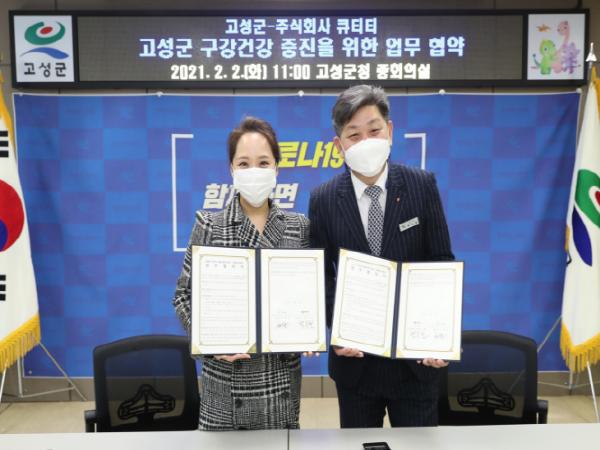 [한국연예축제일보, 한진우기자] 고성군은 주식회사 큐티티(대표이사 고태연)와 2월 2일 고성군청 중회의실에서 비대면 구강보건관리를 위한 업무협약을 체결했다.