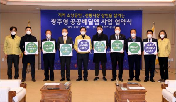 광주시는 국내 배달앱 시장의 점유율 편중을 해소하고 포스트 코로나에 대비해 비대면 산업과 지역 소상공인과 자영업자들을 지원하기 위해 주식회사 위메프오, (재)광주경제고용진흥원, 광주은행, 광주광역시소상공인연합회, (사)한국외식업중앙회 광주지회, 광주광역시상인연합회, 한국프랜차이즈산업협회 광주전남지회 등과 2일 ‘광주형 공공배달앱’업무협약을 체결했다.
