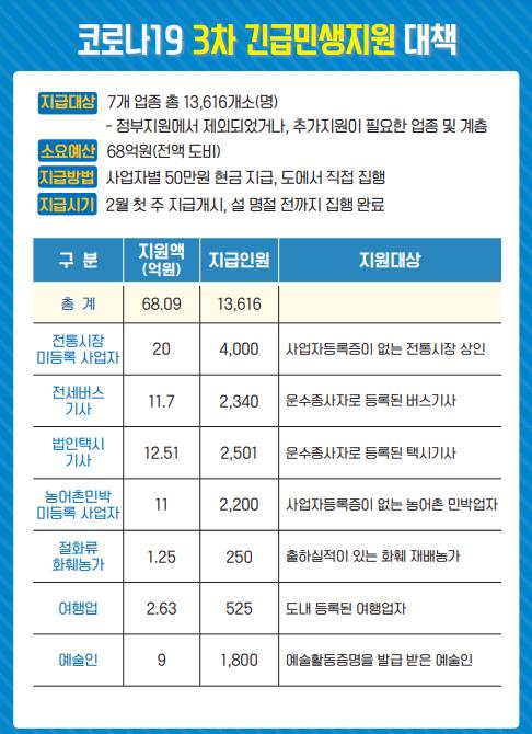지원대상은 총 7종으로, ▲전통시장(미등록사업자) ▲전세버스기사 ▲법인택시기사 ▲농어촌민박(미등록사업자) ▲절화류 재배 화훼농가 ▲여행업 ▲예술인 등이 해당되며, 대상별로 50만원씩 일괄 지원에 나서기로 했다.