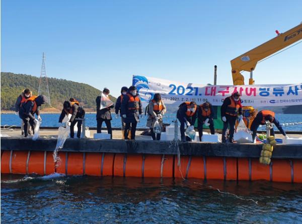 [한국연예축제일보, 유혜경기자] 통영시는 코로나19 방역수칙을 준수하여 (사)한국수산업경영인 통영시연합회와 함께 2월 2일 용남면 원평 해역에서 어업인 소득증대를 위한 ‘대구 자어 방류행사’를 개최했다.